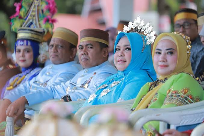 Dimana, Bupati Wajo Andi Rosman bersama wakilnya dr Baso Rahmanuddin kompak mengenakan pakaian adat bugis berwarna biru tua.